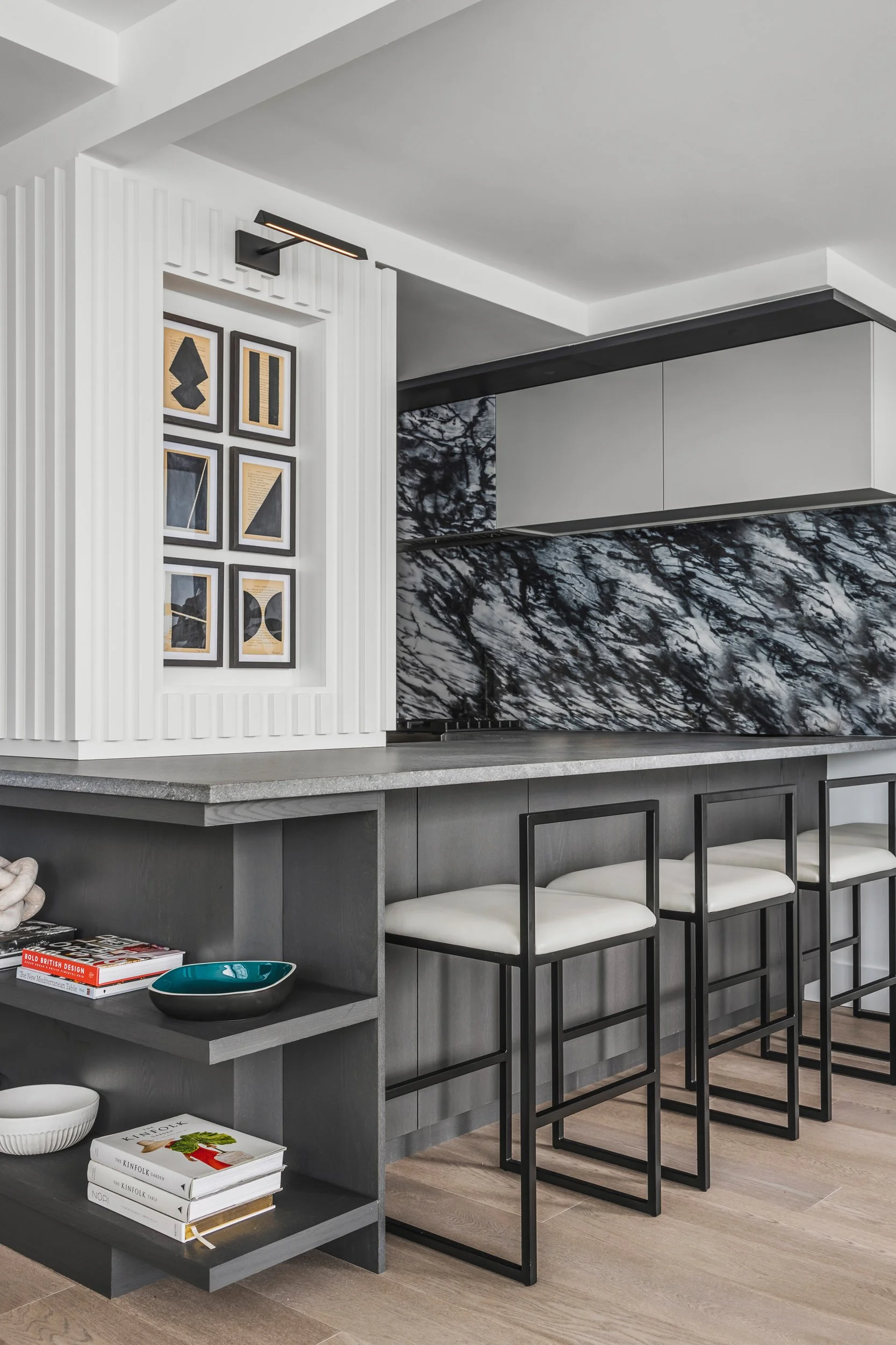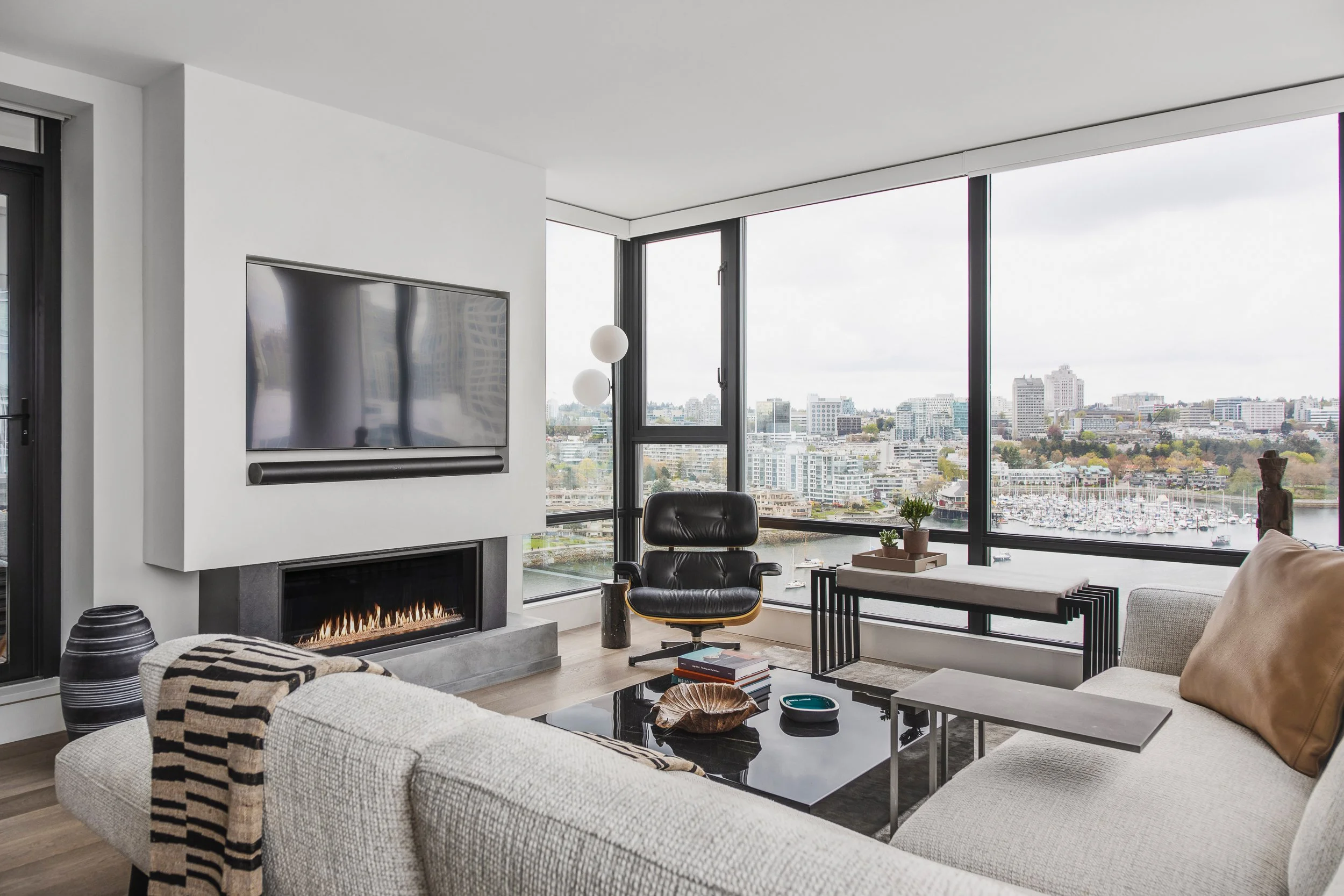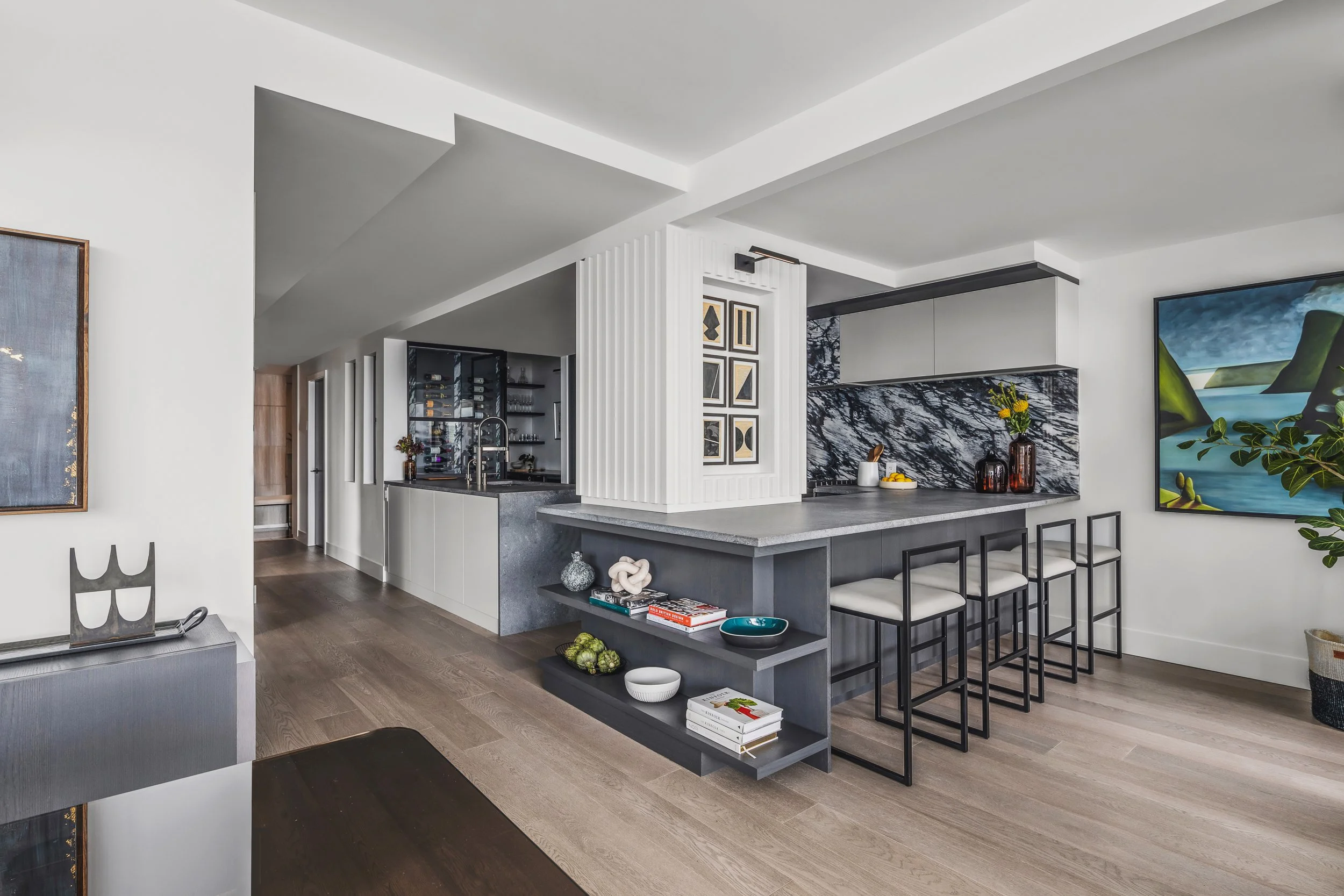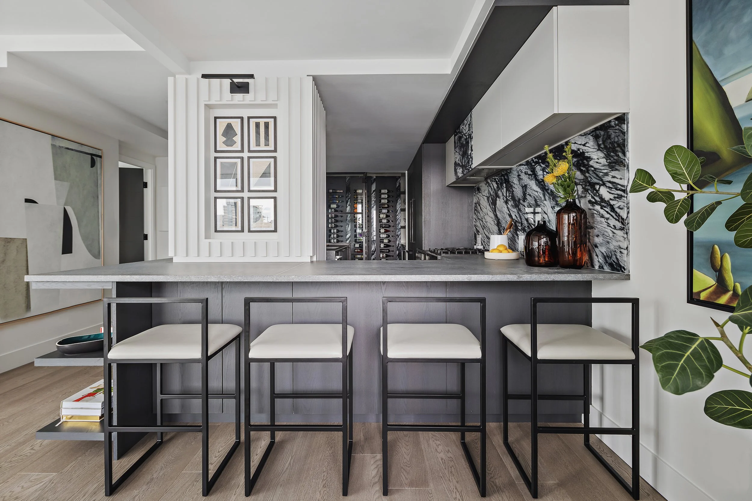 Designed around expansive downtown water views, this bold, contemporary condo was created for clients seeking something daring, masculine, and ideal for entertaining. Leaning into darker tones and statement stone, the space was completely reimagined to include a luxurious, oversized kitchen with serious wow factor, a custom walk-in closet, and a dedicated wine cellar. Complex layout challenges - including structural posts within the kitchen - were embraced and transformed into sculptural features, ultimately becoming some of the home’s most unique and celebrated design moments.