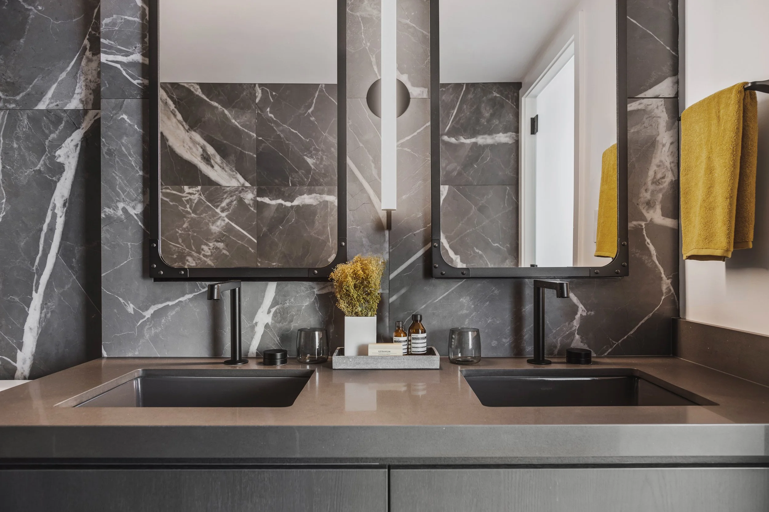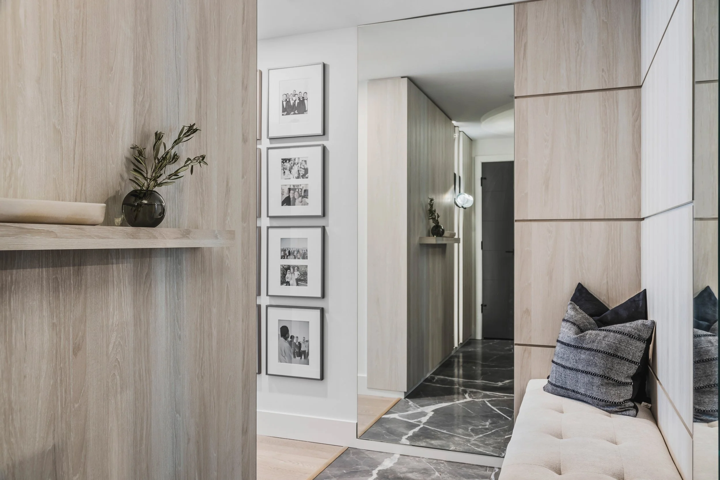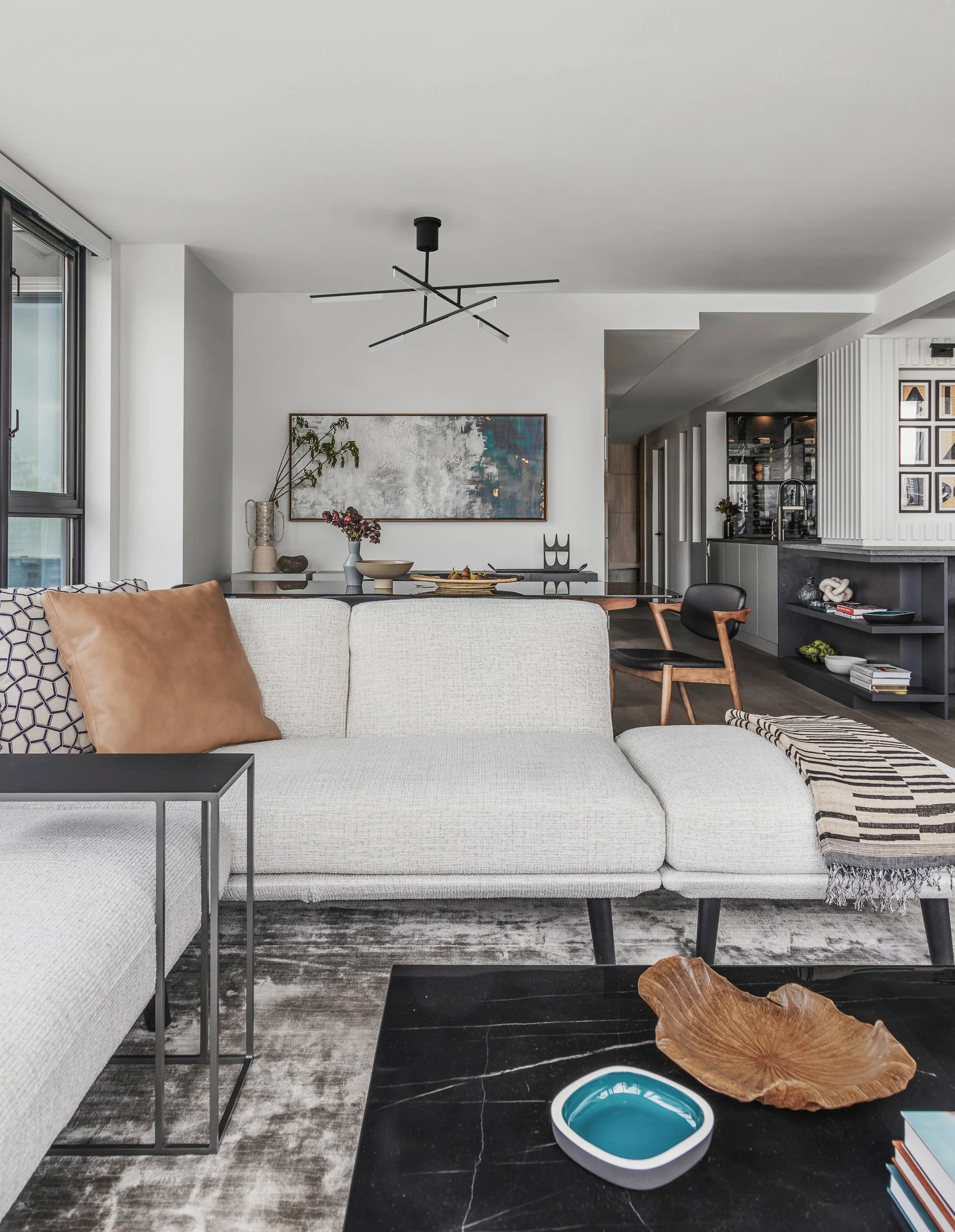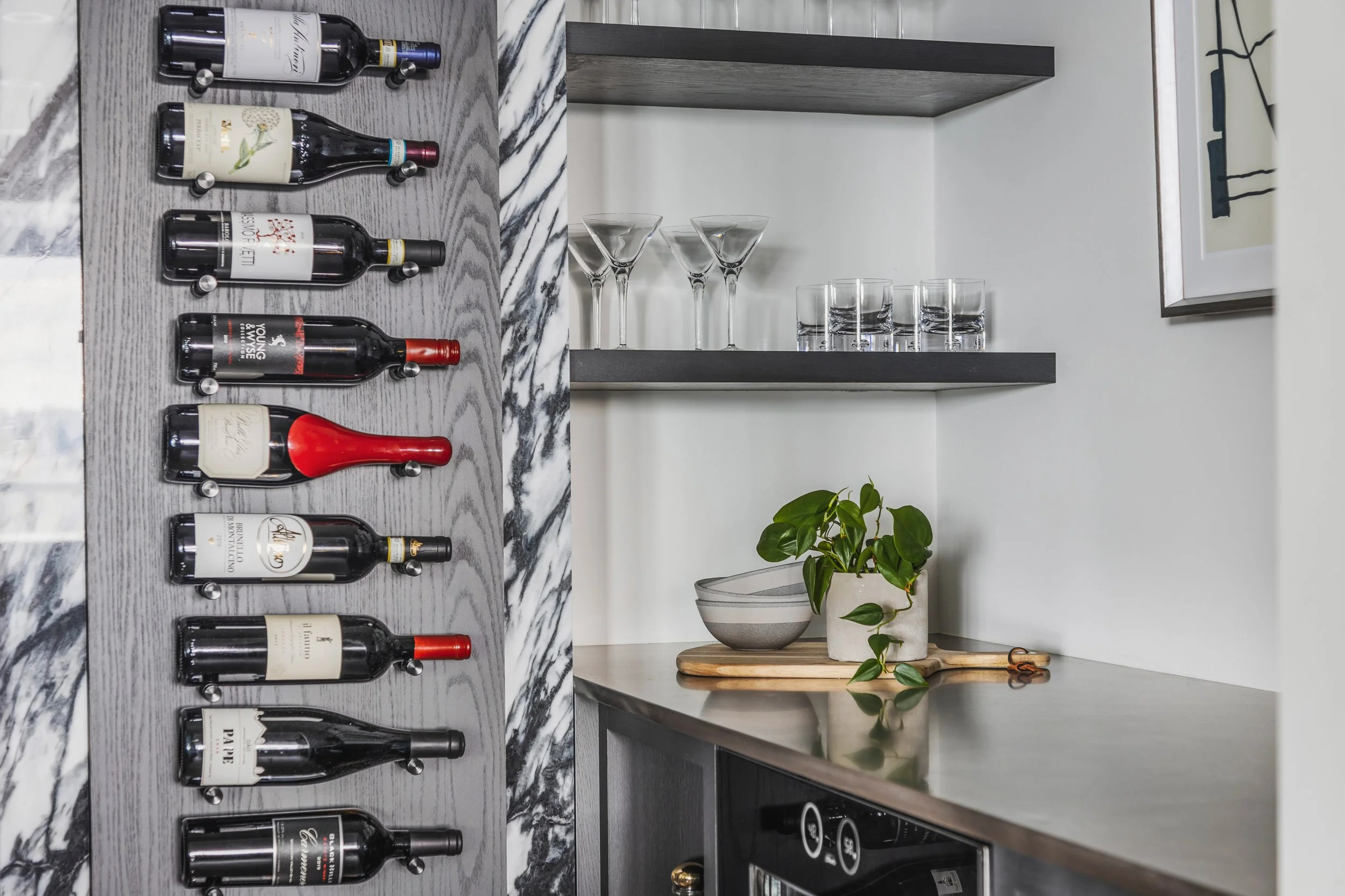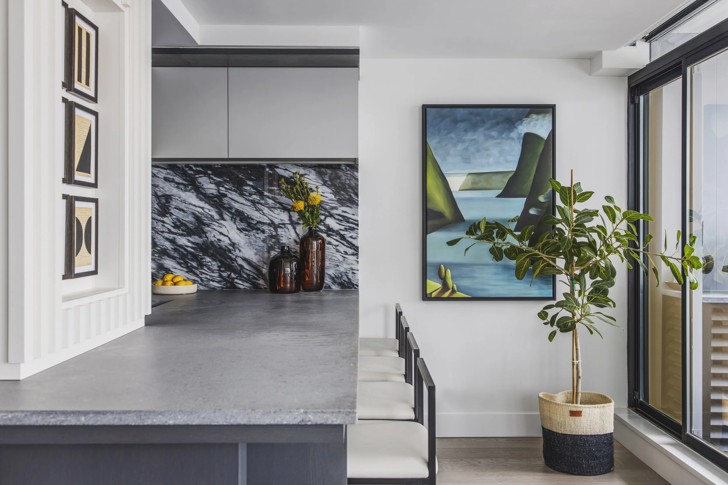 Designed around expansive downtown water views, this bold, contemporary condo was created for clients seeking something daring, masculine, and ideal for entertaining. Leaning into darker tones and statement stone, the space was completely reimagined to include a luxurious, oversized kitchen with serious wow factor, a custom walk-in closet, and a dedicated wine cellar. Complex layout challenges - including structural posts within the kitchen - were embraced and transformed into sculptural features, ultimately becoming some of the home’s most unique and celebrated design moments.