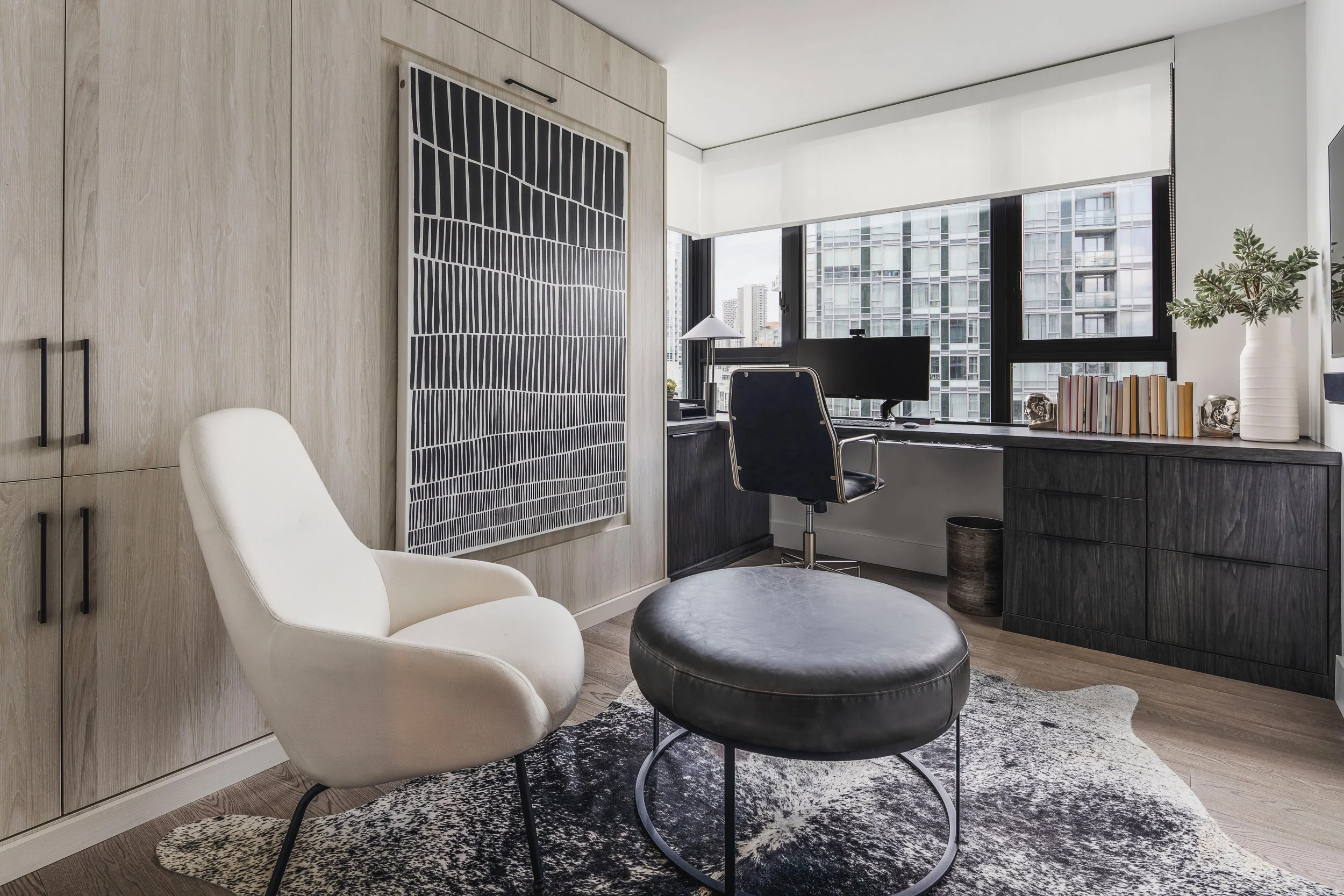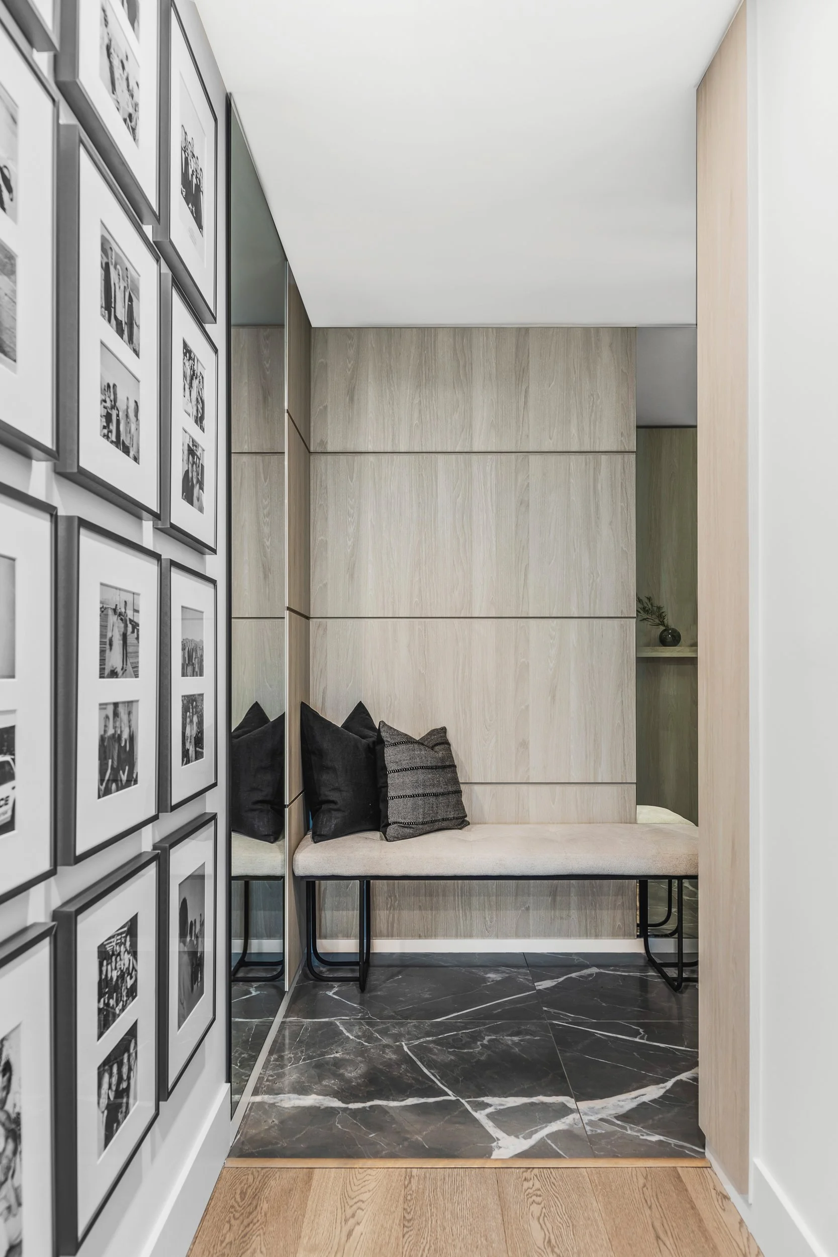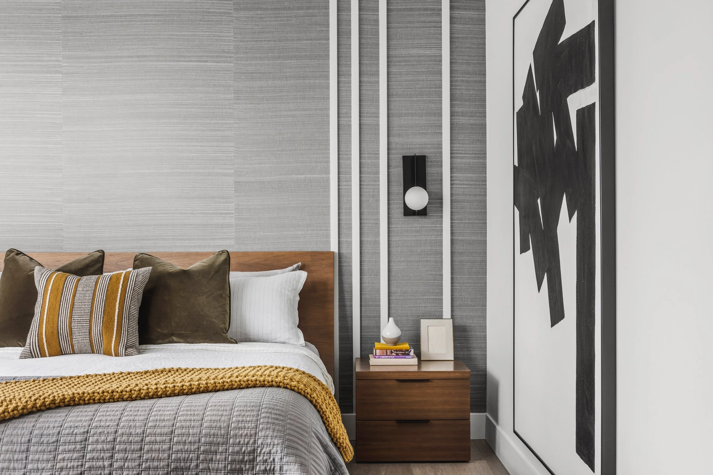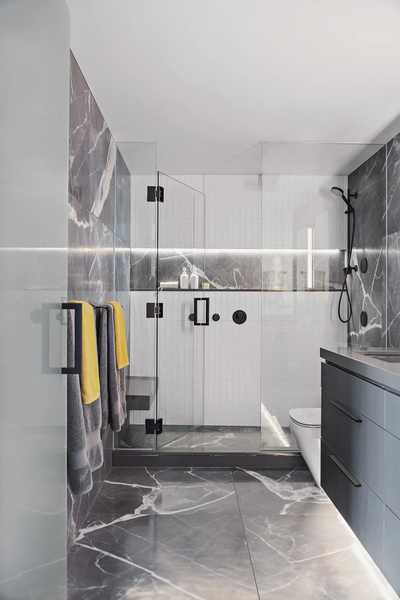 Designed around expansive downtown water views, this bold, contemporary condo was created for clients seeking something daring, masculine, and ideal for entertaining. Leaning into darker tones and statement stone, the space was completely reimagined to include a luxurious, oversized kitchen with serious wow factor, a custom walk-in closet, and a dedicated wine cellar. Complex layout challenges - including structural posts within the kitchen - were embraced and transformed into sculptural features, ultimately becoming some of the home’s most unique and celebrated design moments.