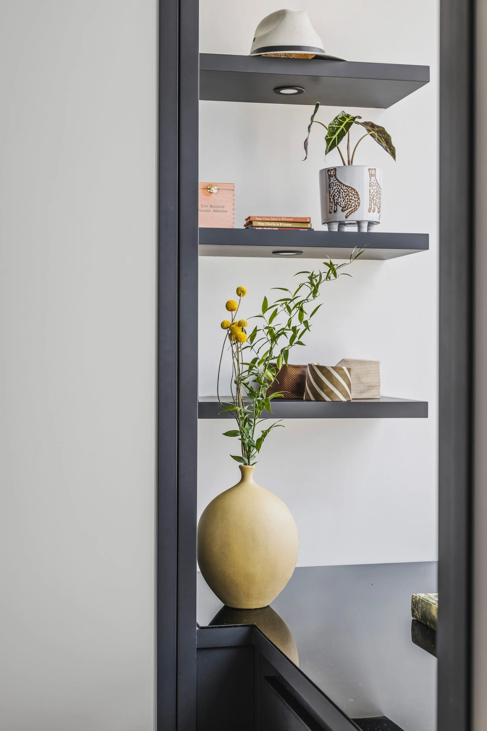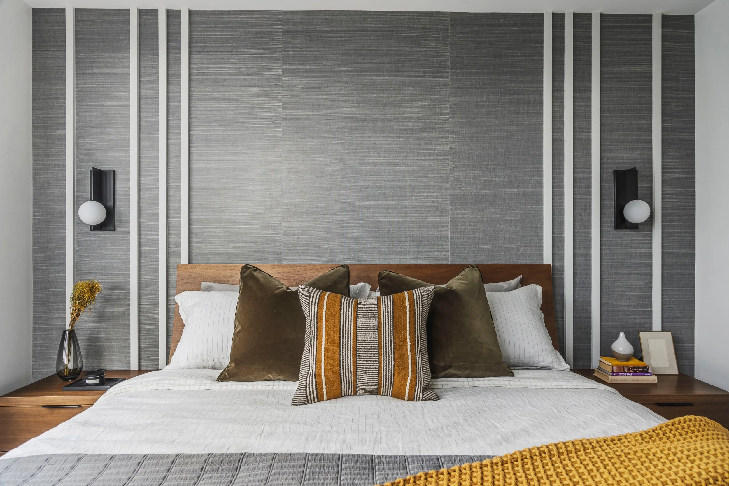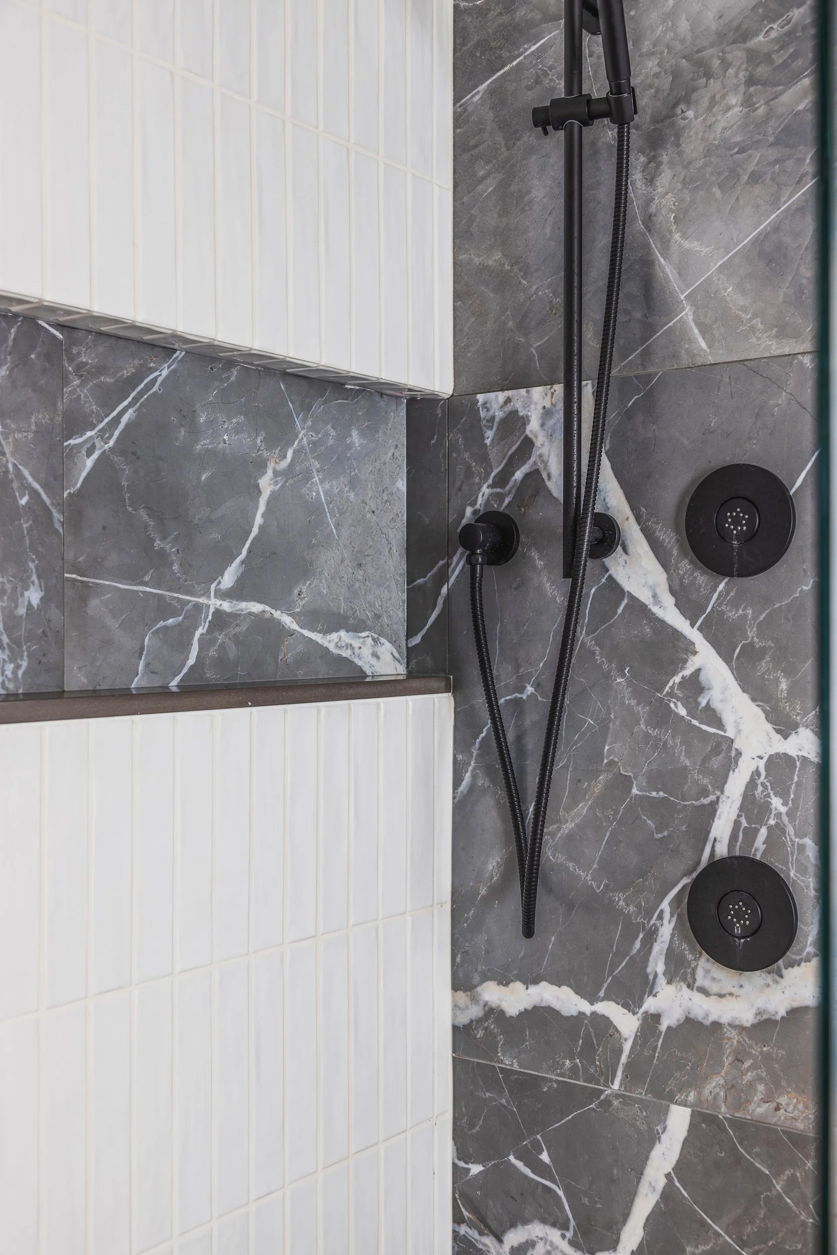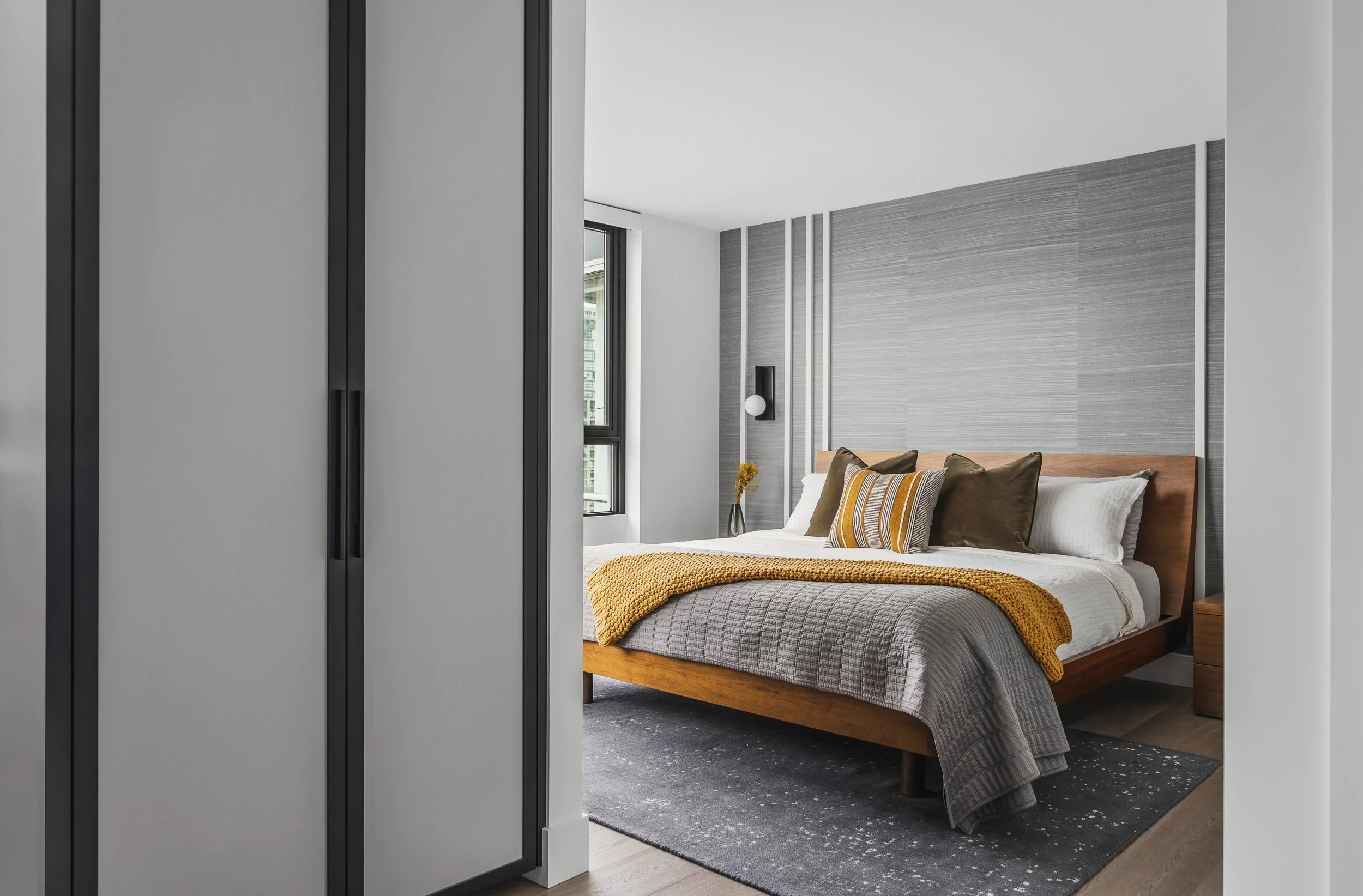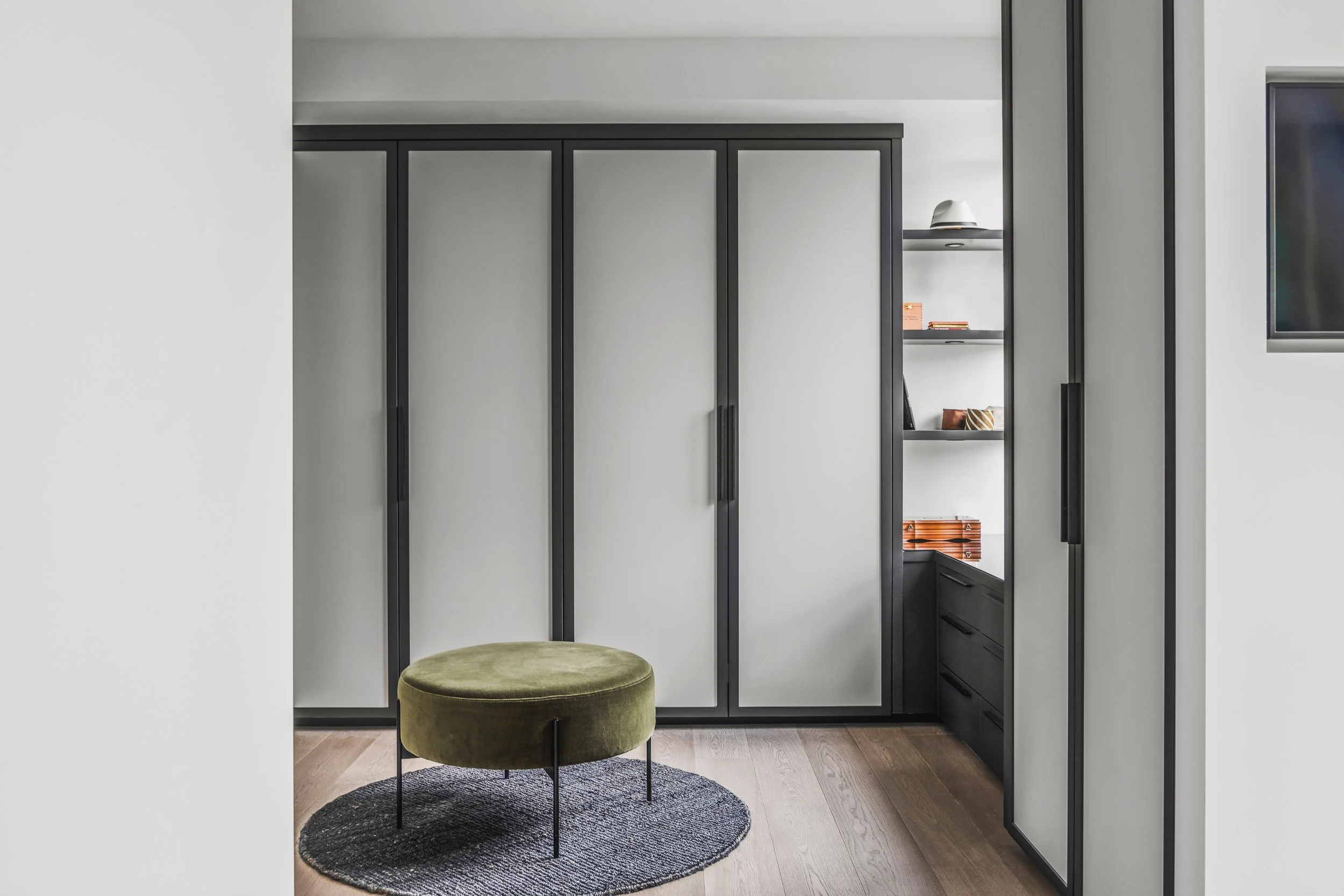 Designed around expansive downtown water views, this bold, contemporary condo was created for clients seeking something daring, masculine, and ideal for entertaining. Leaning into darker tones and statement stone, the space was completely reimagined to include a luxurious, oversized kitchen with serious wow factor, a custom walk-in closet, and a dedicated wine cellar. Complex layout challenges - including structural posts within the kitchen - were embraced and transformed into sculptural features, ultimately becoming some of the home’s most unique and celebrated design moments.