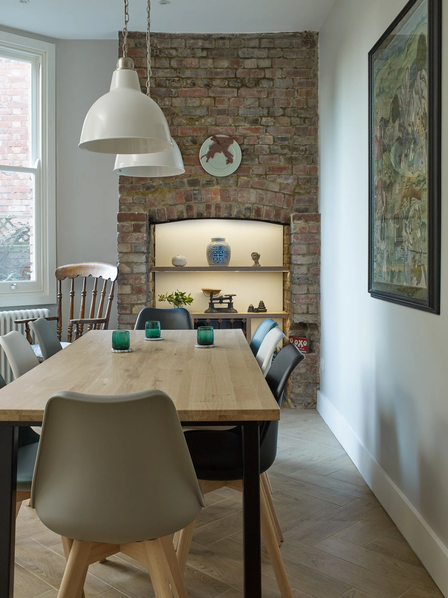 Located in London, this Edwardian-period home is a project close to our hearts, with Alexandra Interiors fully assisting in both the renovation and furnishing from start to finish. Opening up the kitchen created a cohesive, open-plan kitchen and dining area where modern and traditional elements work in harmony, blending oak herringbone flooring, original rustic brick, and a contemporary take on the classic white shaker kitchen. The project was completed with the design of a guest bathroom, introducing a confident splash of colour and personality to round out the home.